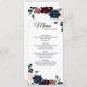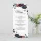 This “Summer Celebration” wedding menu inspires a traditional and elegant floral atmosphere for a garden wedding reception. With pink, royal blue, and cabernet burgundy flowers, the rich reds and navy palate combined with gold glitter compliment formal spring, summer and autumn themes, creating a classic and versatile luxury marriage celebration experience.
