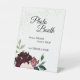 This “Summer Celebration” wedding photo booth pedestal sign inspires a traditional and elegant floral atmosphere for a garden wedding reception or event. With pink, royal blue, and cabernet burgundy flowers, the rich reds and navy palate combined with gold glitter compliment formal spring, summer and autumn themes, creating a classic and versatile luxury marriage celebration experience.