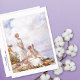A fine art postcard with the painting by Charles Courtney Curran (1861-1942), Summer Clouds (1917). An American Impressionist painter of figures and landscapes. The painting showcases three women, adorned in white attire, one standing and two seated on a cliff against the backdrop of a cloudy blue sky.