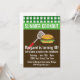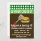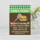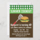 This cookout party invitation features a cheeseburger and a spatula and a green checkered tablecloth and text fields for your party information.