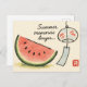 Capture the fleeting beauty of summer with this handmade-style Japanese etegami postcard. Featuring a nostalgic watercolor illustration of a watermelon slice and a delicate wind chime (fūrin), this 4x6 inch postcard evokes the charm of warm days and gentle breezes.