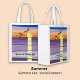 Created for local fairs or in-store summer events, this reusable tote features a stylized sunset, framed in white for a clean finish. The lower third bar allows a centered tagline in Bandakala font: “Infused with Summer Light”. The back highlights your social platforms and includes @handles and hashtags with a CTA to connect.