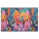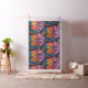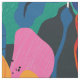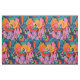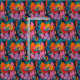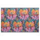A bright colored abstract summer floral pattern in shades of gold, orange, pink, blue and green.