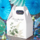 This summer floral green foliage wedding favor box is perfect for a simple wedding. The design features watercolor green leaves and pink flowers bunched in artistic looking bouquets.