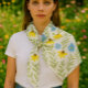 Elevate any ensemble with this vibrant, chiffon scarf, featuring a digitally rendered watercolor design of bachelor buttons and black-eyed Susans on a white background. This scarf makes an excellent gift for birthdays or special occasions. Perfect for adding flair to sundresses for church, a dinner out, or any event. It is sure to complement solid-colored dresses.
