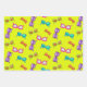Summer party wrapping paper sheets in bright colors and fun, girly design. Sunglasses make a pattern over bright chartreuse on the first sheet. The other sheets have a design of palm trees, seashells, flip flops, sunshine, and sea stars over bright aqua blue and lightly colored wide stripes.