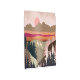 An abstract landscape with unique colors and textures showing a nature landscape with a rising sun and two geese in shades of orange, beige, brown and pink.