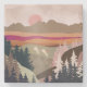 An abstract landscape with unique colors and textures showing a nature landscape with a rising sun and two geese in shades of orange, beige, brown and pink.