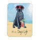It’s a dog’s life! Be cool and celebrate the dog days of summer with this cute Great Dane puppy wearing sunglasses and relaxing with a drink on a beach.