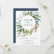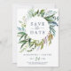 This summer greenery save the date card is perfect for an elegant midsummer wedding. The botanical design features a lush arrangement of painted watercolor eucalyptus, greenery, and green leaves with subtle sprigs of blush pink blossoms.