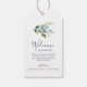These summer greenery wedding welcome gift tags are perfect for an elegant midsummer wedding. The botanical design features a lush arrangement of painted watercolor eucalyptus, greenery, and green leaves with subtle sprigs of blush pink blossoms. Personalize the tags with the location of your wedding, a short welcome note, your names, and wedding date. These tags are perfect for destination weddings and hotel guest welcome bags.