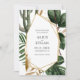 Save The Date invitation features tropical greenery with trendy gold geometric centerpiece. Perfect look for summer and modern eco weddings.