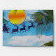 Blue sunny sky with a flying Santa on his sleigh sending reindeer through the sky fantasy scene.