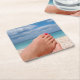 Coaster with women's feet with pink red nail polish on a white beach on an island in the mediterranean sea relaxing during the summer holidays.