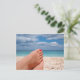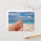 Postcard of women's feet with pink red nail polish on a white beach on an island in the mediterranean sea relaxing during the summer holidays.