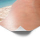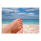 Photo print of women's feet with pink red nail polish on a white beach on an island in the mediterranean sea relaxing during the summer holidays.