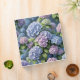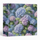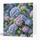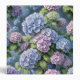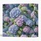 Clusters of vibrant hydrangea flowers in shades of blue and purple with green leaves on a soft, muted background