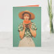 A cheerful woman in a sunhat and floral shirt enjoys a slice of watermelon against a vibrant teal background, capturing a perfect moment of summertime happiness.