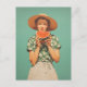 A cheerful woman in a sunhat and floral shirt enjoys a slice of watermelon against a vibrant teal background, capturing a perfect moment of summertime happiness.