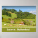 An idyllic poster of a summer landscape of cows grazing in a green pasture in Switzerland.