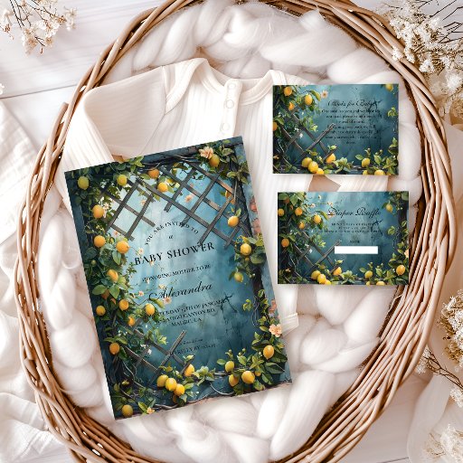 A soft and refreshing lemon-botanical design inspired by summer gardens. Lush citrus branches, white blossoms, and watercolor greenery frame your event details beautifully against a gentle mint-green background. The warm, airy aesthetic creates a charming atmosphere perfect for celebrating a mother-to-be. Elegant, fresh, and timeless—an effortless choice for a bright, nature-inspired baby shower.