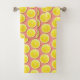 A pattern of fresh & juicy lemon slices in bright, vivid shades of yellow, with a watercolour texture to give it that freshly cut look. They are placed on a salmon pink background for a bright & summery look, like pink lemonade.