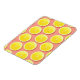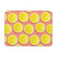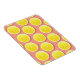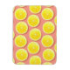 A pattern of fresh & juicy lemon slices in bright, vivid shades of yellow, with a watercolour texture to give it that freshly cut look. They are placed on a salmon pink background for a bright & summery look, like pink lemonade.