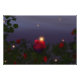 In the dusk of a summer night fireflies float and glow over a rose garden filled with vibrant red roses.
