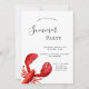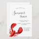 An elegant invitation for a nautical coastal by the sea summer party, beach party or seafood party. A white background and a large red lobster as decoration. Templates for your party details, information.
