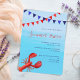 An elegant invitation for a nautical coastal by the sea summer party, beach party or seafood party. Blue sea water as background and a large red lobster and black and red flags as decoration. Templates for your party details, information.