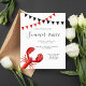 An elegant invitation for a nautical coastal by the sea summer party, beach party or seafood party. A white background and a large red lobster and black and red flags as decoration. Templates for your party details, information.