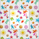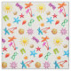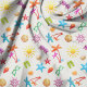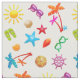 Sewing and crafting fabric with a summer pattern design. Bright tropical colors make up this fun collection of seashells, starfish, palm trees, sunglasses, flip flop sandals, and more. Choose any background color, in cotton, linen, twill, or leave it neutral.
