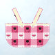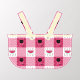 As an homage to the tasty treats of summer, this classic picnic tablecloth pattern is adorned with a slice of watermelon surrounded by ants and seeds in the white squares and a kettle grill framed by steaks, mushrooms, and charcoal pieces in the other. A picnic basket silhouette creates a cute mask for the pattern.