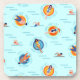 Cute ice blue color theme of a pool party with funky illustration design of pool toys and people having fun in a large aquamarine pool. Perfect for a Summer vacation holiday vibe.