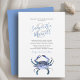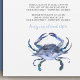 Set the tone for your seaside celebration with these coastal summer rehearsal dinner invitations. Featuring your names in a stylish handwritten script and event details in a classic serif font, these custom invitation cards are printed on a crisp white background and highlighted with an original watercolor blue crab illustration in rich ocean blues.