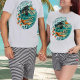 Like a postcard from paradise stitched into cotton—this retro beach trip tee feels like stepping back into the golden age of family vacations. The circular layout bursts with sunset tones of orange, coral, and yellow, balanced by turquoise waves and deep teal accents that echo vintage seaside posters. Palm trees sway under a radiant sun, while playful typography frames the design with customizable spaces for your family name, year, or destination. Perfect for summer reunions, spring break, or beach parties, it’s more than a shirt—it’s a keepsake you can wear. Slip into this throwback vibe, let the colors sing, and carry your adventure like a retro souvenir that never fades.