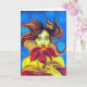 This colorful and unique greeting card celebrates the fresh brilliance of summer. Card features a woman holding a bright red flower as her hair blows in the breeze.