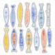 Colorful fish in shades of blue, orange, and yellow. Inspired by Mediterranean sardines and Scandinavian design, these are the perfect pop of color to any of your favorite gear or stationery. 13 individual fish stickers on one sheet.