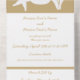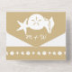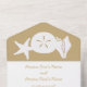 Bring touch of summer fun to your event with this all-in-one wedding invitation and RSVP card. On the inside you will find the white silhouettes of a starfish, sand dollar, and conch seashell on a sandy tan background above a section with some sample text that can be customized for your special day. The lower section of the invite features a removable, postcard sized piece that has some sample RSVP text sitting above a sand border with a pattern of seashells, starfish, and sand dollars scattered across the bottom. Outside, a similar border of seashells on tan can be found below the areas where you would add stamps, standard, and return addresses for both the invitation as a whole and the returnable RSVP section. The flap used to fold over and seal the card has the starfish, sand dollar, and conch shell on a sand background with a sample set of initials that you can customize for a final personal touch and to cinch the summer beach feel. Be sure to check out the rest of the Summer Seashells in Sand set for other coordinating products, including return address labels.