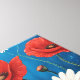 This vibrant painting captures the joyful essence of a summer meadow. Bold red poppy blossoms, with their delicate, crinkled petals and dark centers, stand proudly amidst a field of cheerful white daisies with sunny yellow hearts. Wispy blades of grass and unopened poppy buds add depth and texture to the scene. The background is a serene blend of blues, suggesting a bright summer sky. The artist's brushstrokes create a sense of gentle movement, as if a light breeze is rustling through the flowers.