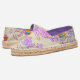 Summer travel and vacation shoes. Slip on, tan espadrilles with purple and pink sea life pattern. Hand-sewn shoes support a cause and are covered with fun sea creatures in gradient purple colors. The illustrations in this sample have a beige background, but the background color (and lining) is easy to customize.. Sea turtles, dolphin, lobster, starfish, octopus and stingrays swim all over these easy to wear slip on shoes.