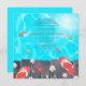 A stunning summer-theme invitation featuring turquoise waters with colorful fish beneath a boardwalk. A pair of flip flops and a collection of seashells and tropical flowers is at the water's edge. Perfect for any beach occasion.
