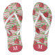A pattern of bright red summer strawberries with green leaves, coupled with green, red, and white stripes makes these attractive flip flops distinctive. Your monogram is in white on a matching dark pink border at the heel.
