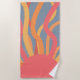 This beach towel has a nature design of a sunrise made of curvy lines in red, yellow, and orange, a sun, and the sky.