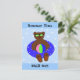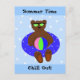 A cool teddybear in a blue floating tube with a bright colored beach ball and sporty sunglasses on. Says Chill Out!