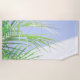 Stylish Pale Green Palm Tree Leaves Blue Sky White Building Background Summer Vibes Beach Towel to add to your collection. A cool gift / present idea for all who love custom design personalized items, positive summer vibes, minimalism, clean lines, nature, plants, beach, holidays, organic theme, yoga, meditation etc. Add your details, customize.