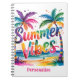 Capture the essence of summer with this vibrant personalized notebook featuring bold "Summer Vibes" lettering across a colorful tropical sunset. Radiant palm trees sway against a glowing ocean backdrop, creating the perfect beach-inspired aesthetic. Ideal for jotting down travel memories, creative ideas, or daily reflections, this notebook blends style and functionality effortlessly. Customize it with your name for a unique, sun-soaked touch!