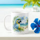 Summer vibes mug featuring a watercolor Parrot on the beach. Customizable.