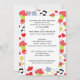 Whimsical casual wedding invitations featuring summer lovebirds, red roses, musical notes and hearts.