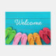 Door mat shown with a cute photo print of summer beach time flip flops welcoming you.